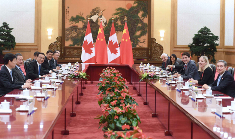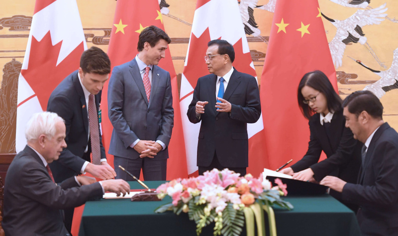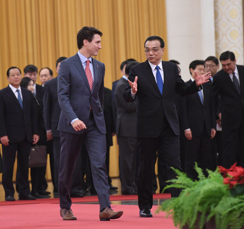 李克强欢迎特鲁多再度访华,积极评价中加关系一年来的发展,充分肯定两国总理年度对话以及外长年度会晤、经济财金战略对话、高级别国家安全与法治对话等机制发挥的积极作用,一致同意发表《中加气候变化和清洁增长联合声明》,建立中加环境、清洁能源两个部长级对话新机制。