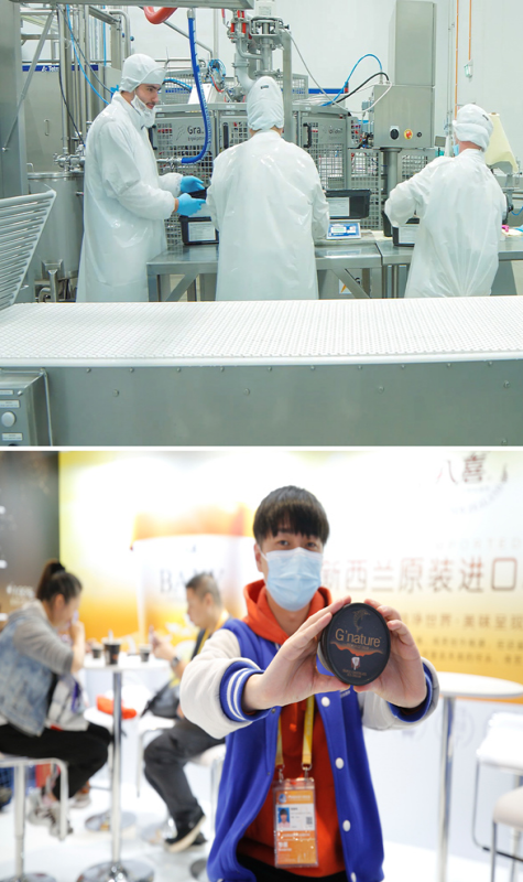 这是一张拼版照片,上图为艾莱发喜新西兰公司员工在冰激凌生产线上工作(资料照片,新华社发);下图为11月7日,工作人员在第三届进博会G'nature展台展示从新西兰进口的冰激凌(新华社记者 张玉薇 摄)。新华社发