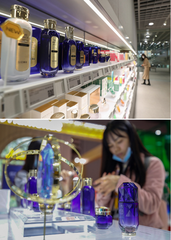 这是一张拼版照片,上图为10月27日在韩国首尔龙山区拍摄的爱茉莉太平洋总部大楼内的“爱茉莉商店”(新华社记者 王婧嫱 摄);下图为11月8日,参观者在第三届进博会消费品展区爱茉莉太平洋展台试用护肤品(新华社记者 张玉薇 摄)。新华社发