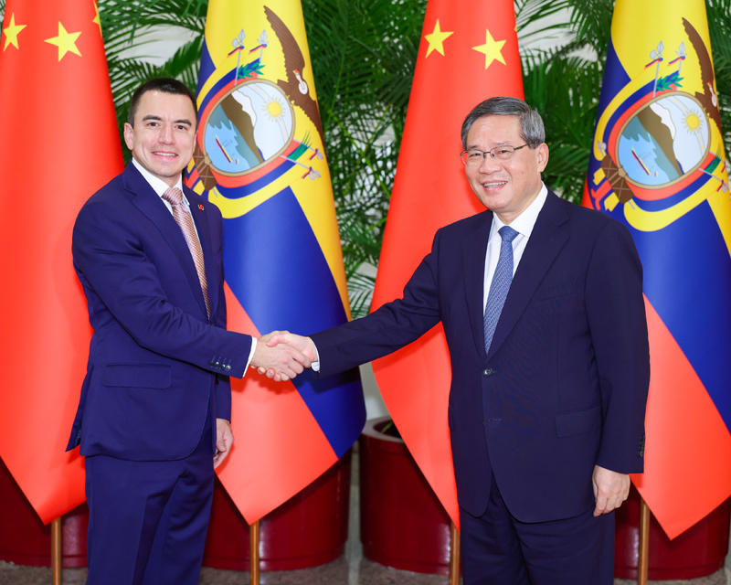 李强指出,中厄同为发展中国家,都把发展经济、改善民生作为重要任务。中方愿同厄方加强发展战略对接,密切“一带一路”合作,扩大双边贸易规模,深化在清洁能源、基础设施、金融等领域合作。中方乐见更多厄方优质产品输华,欢迎厄方用好进博会等推介平台。双方要继续加强教育、文化、青年等领域交流合作,便利人员往来,夯实两国关系的民意基础。中方愿同厄瓜多尔等拉美和加勒比国家一道,以共建中拉命运共同体“五大工程”为契机,在实现现代化的道路上携手前行。中方也愿同厄方加强在联合国等多边机制的沟通协调,践行真正的多边主义,为维护世界和平和发展、推动构建人类命运共同体作出积极贡献。